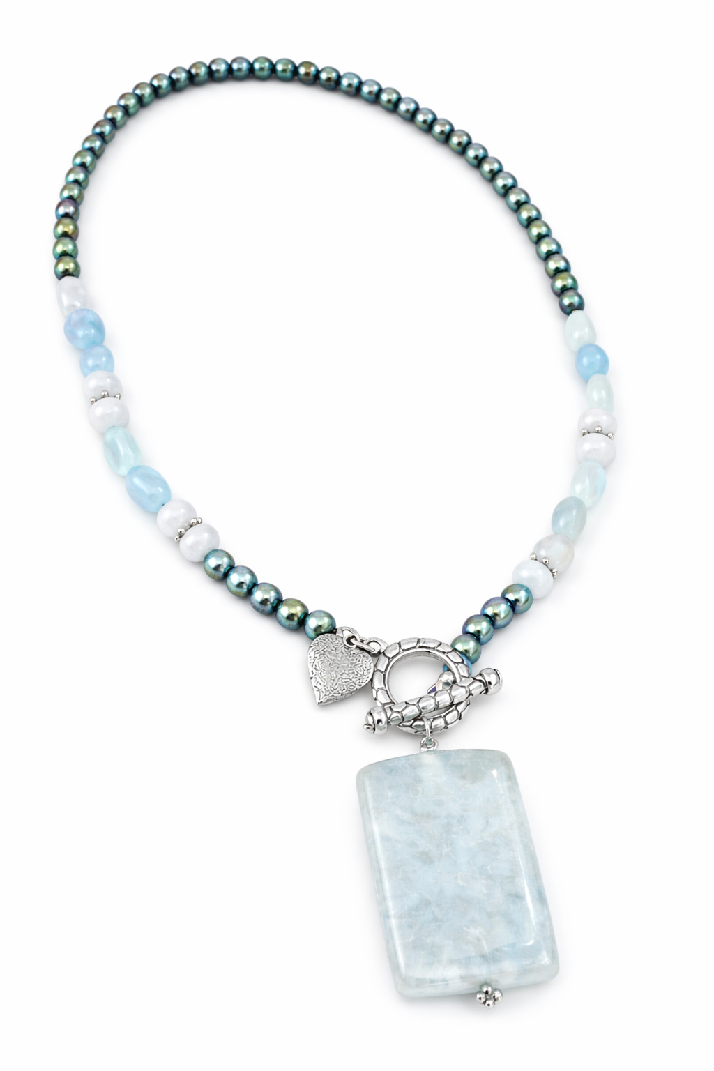Hand-strung aqua agate beads flow into rich blue hematite accents, creating a subtle shimmer reminiscent of sunlight dancing on waves. The front toggle clasp adds both ease and elegance, while the heart charm offers a meaningful touch — a reminder that even the deepest waters carry light within them.