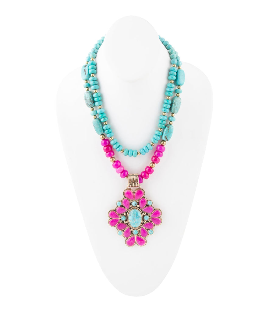 Unlock your inner style with our Barcelona Pink Agate Cross Golden Pendant Necklace, crafted and finished by hand for a beautiful, one-of-a-kind look. The necklace and pendant are composed of genuine blue turquoise and genuine pink agate with golden bronze. It measures 20.25" plus a 2" extender with lobster clasp for the perfect fit. Turn heads in a bold statement pendant with this 4" long and 2.87" wide at its widest point with a total weight of 7.92oz!