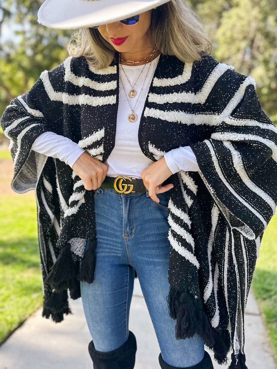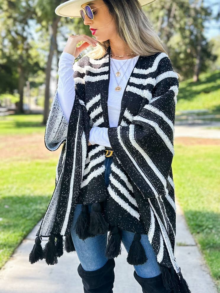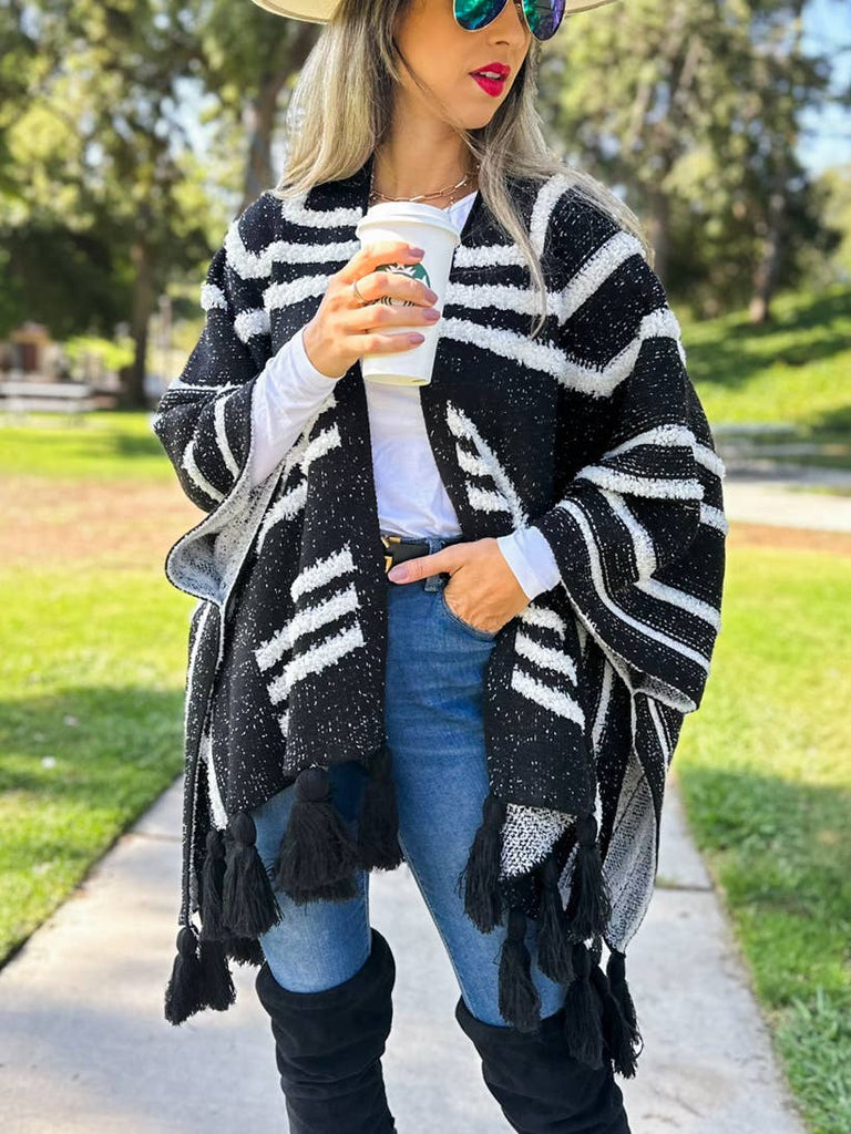 Enhance your collection with our Black Textured Knit Tassel Kimono Cardigan, a luxurious addition that combines elegance and comfort. This cardigan is expertly crafted from 100% acrylic, offering a soft and warm layer suitable for any season. It features a unique textured pattern inspired by Western aesthetics, and is adorned with chunky tassels for a sophisticated yet playful look. The open-front style and one-size-fits-most design up to 1XL ensure a versatile and flattering fit, making it an essential piece for any fashion-forward customer.