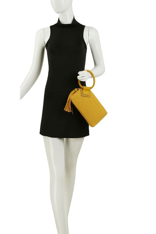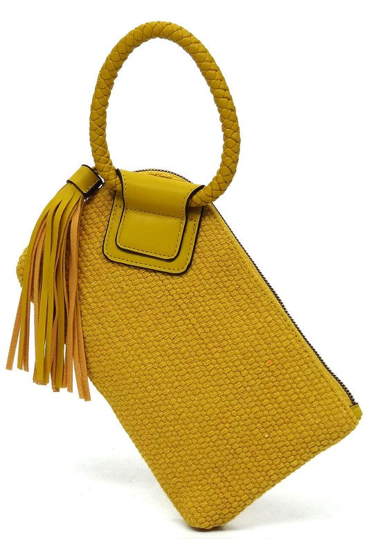 Canvas Cuff Handle Tassel Wristlet Clutch Canvas Faux vegan leather trim Zip top closure Gold-tone hardware L 10.5 * H 6.1 * W 1 (4.5 D)