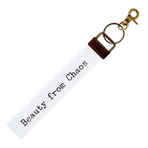 This versatile canvas strap is your go-to companion for keys, small essentials, and so much more. Featuring a sturdy split ring and spring clasp closure, it doubles as a wristlet for tiny purses or a phone lanyard. Measuring 8.75 inches long and 2.5 inches wide, it's the perfect size for everyday carry. The vintage brass snap and inspiring "Beauty From Chaos" message remind you that wisdom blooms from life's messiest moments. White canvas with black print and delicate florals makes this both functional and fabulous.