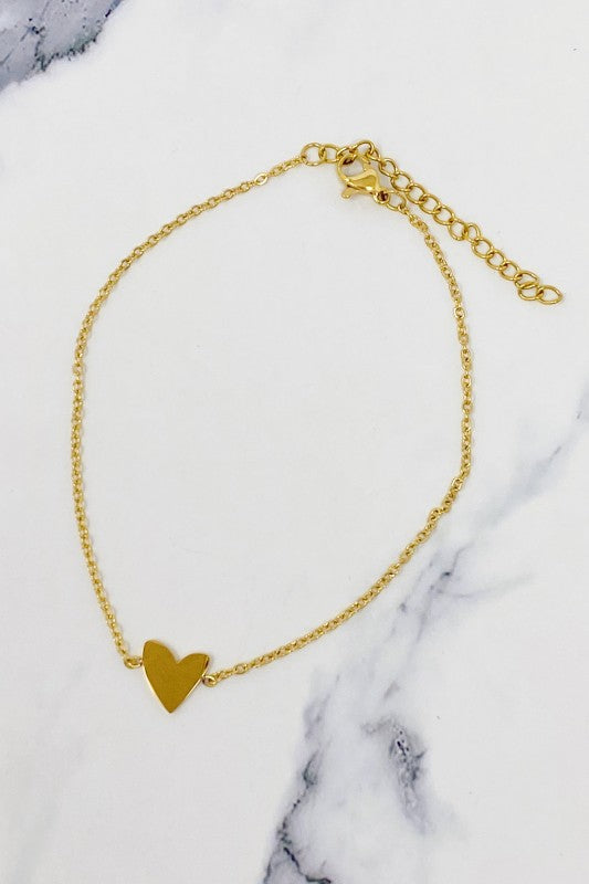 Anklet with flattened polished heart charm. Simple with style, absolutely adorable!8.5” long with 2” extenderGold plated Stainless Steel that last long with no tarnishLead and Nickel FreeMade in China