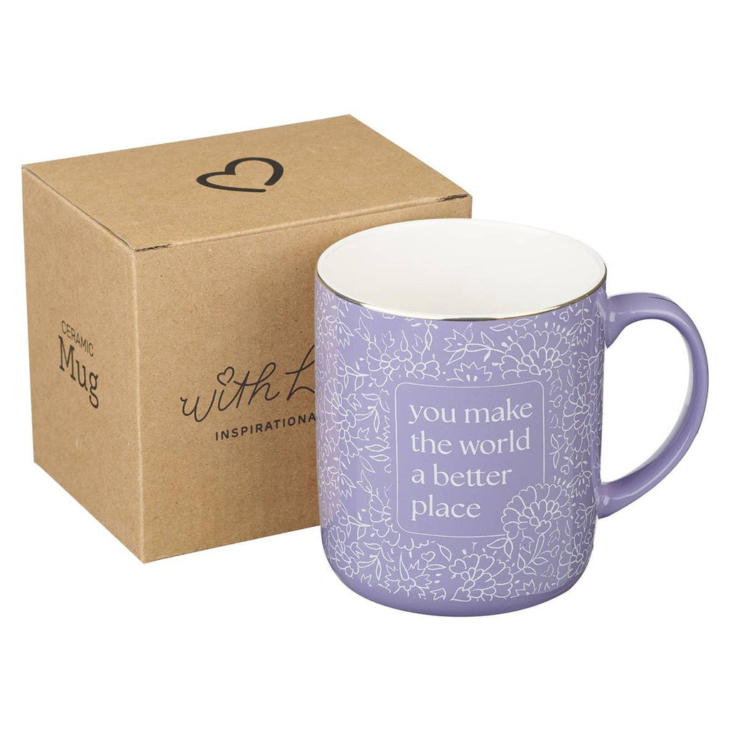 Say a big thank you for a huge favor by giving the You Make The World a Better Place Purple Ceramic Coffee Mug to a friend, family member, or teacher. It's a heartfelt way to show your appreciation for someone who has gone above and beyond, and she will remember your gratitude every time she uses the mug. Purple exterior with white floral design,  White screen-printed text, You make the world a better place, Metallic rim,  Glossy white interior,  Ceramic mug,  Not microwave and dishwasher-safe due to metallic rim, Hand-wash recommended, Packaged in a tuck-top Kraft cardboard box,  Mug dimensions: 4.8" x 4.1" x 3.6" (122 x 106 x 91mm), Packaging dimensions: 4.7" x 4.3" x 3.7" (119 x 109 x 94mm),  Capacity: 14 fl oz (414ml)