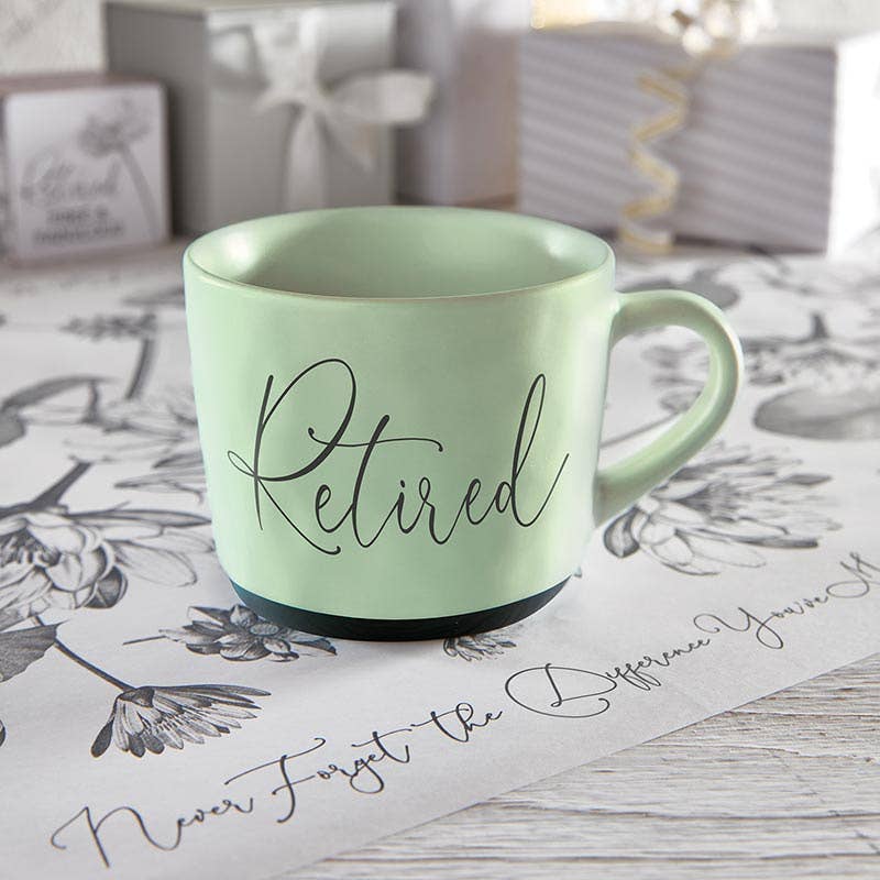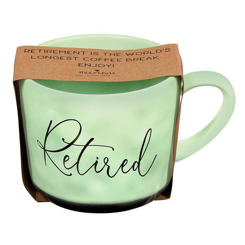 Mug Reads: Retired Packaging reads: Retirement is the world's longest coffee break...enjoy! • Keep your mornings cozy & memorable with this handmade style mug • Perfect gift for retirement! • Material: Stoneware • Size: 3.25" H, 15oz • Care Instructions: Dishwasher and Microwave Safe