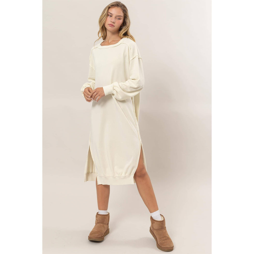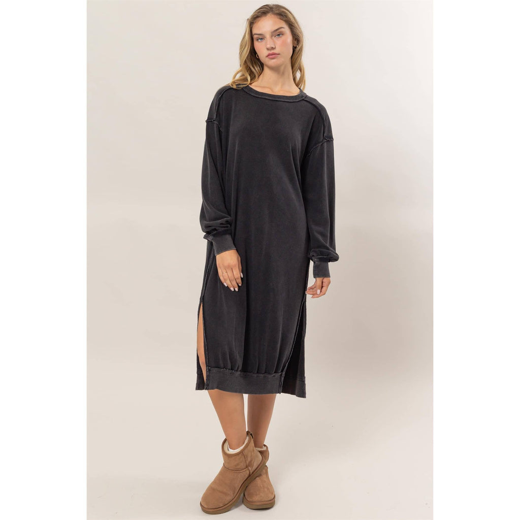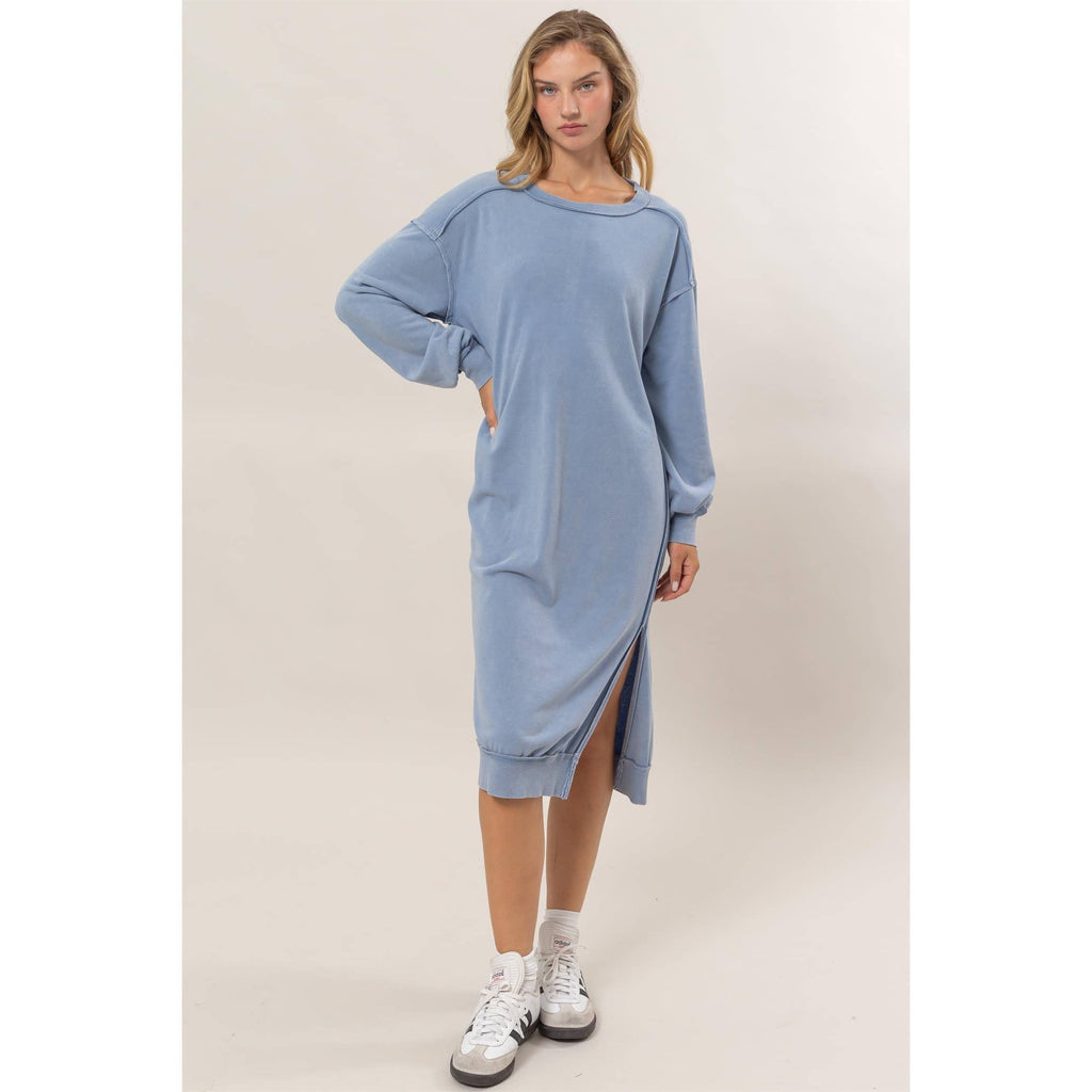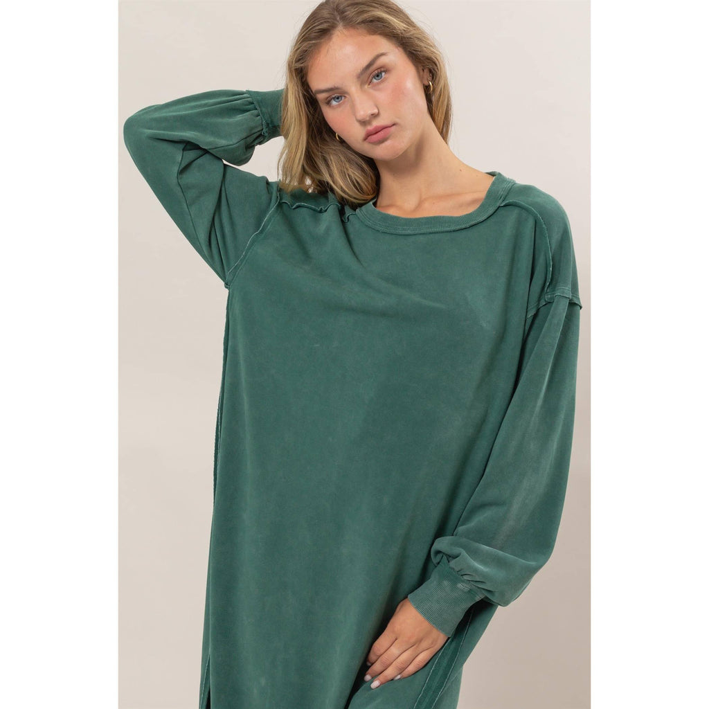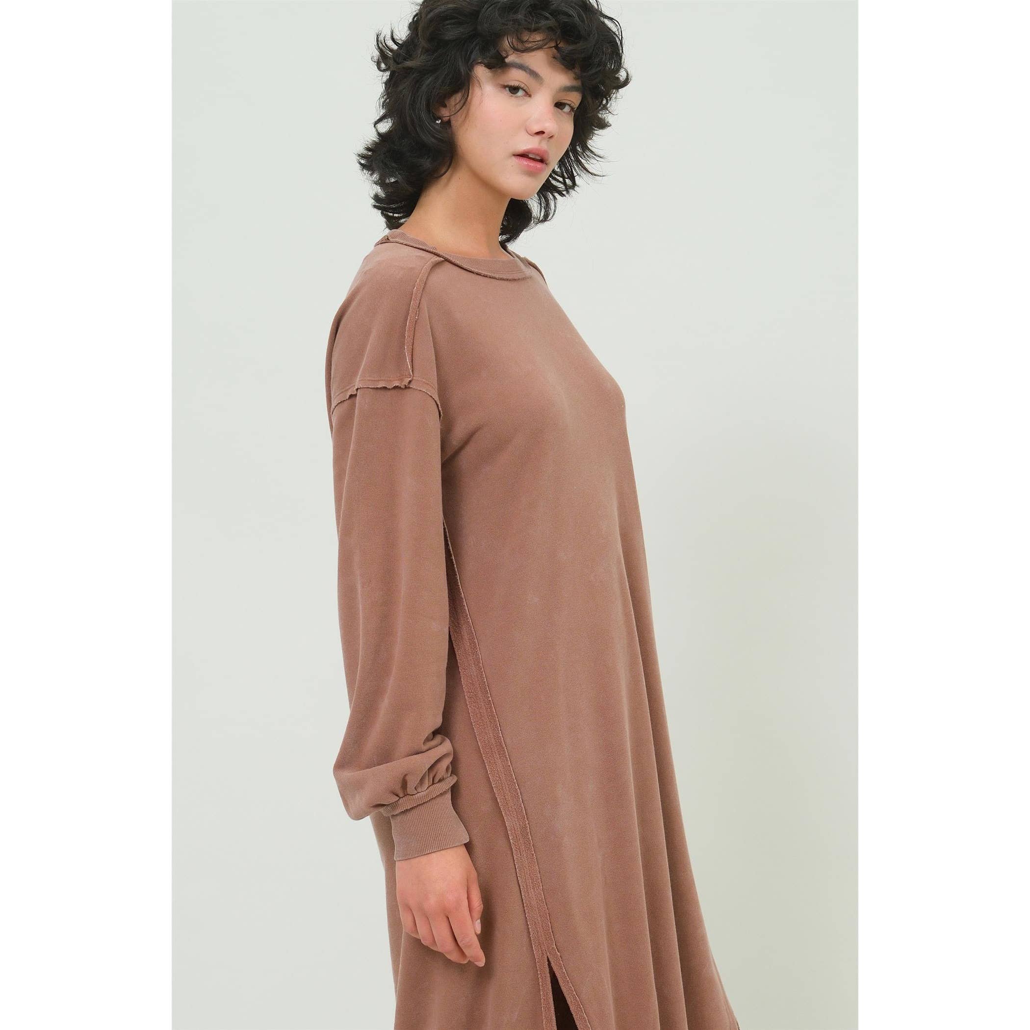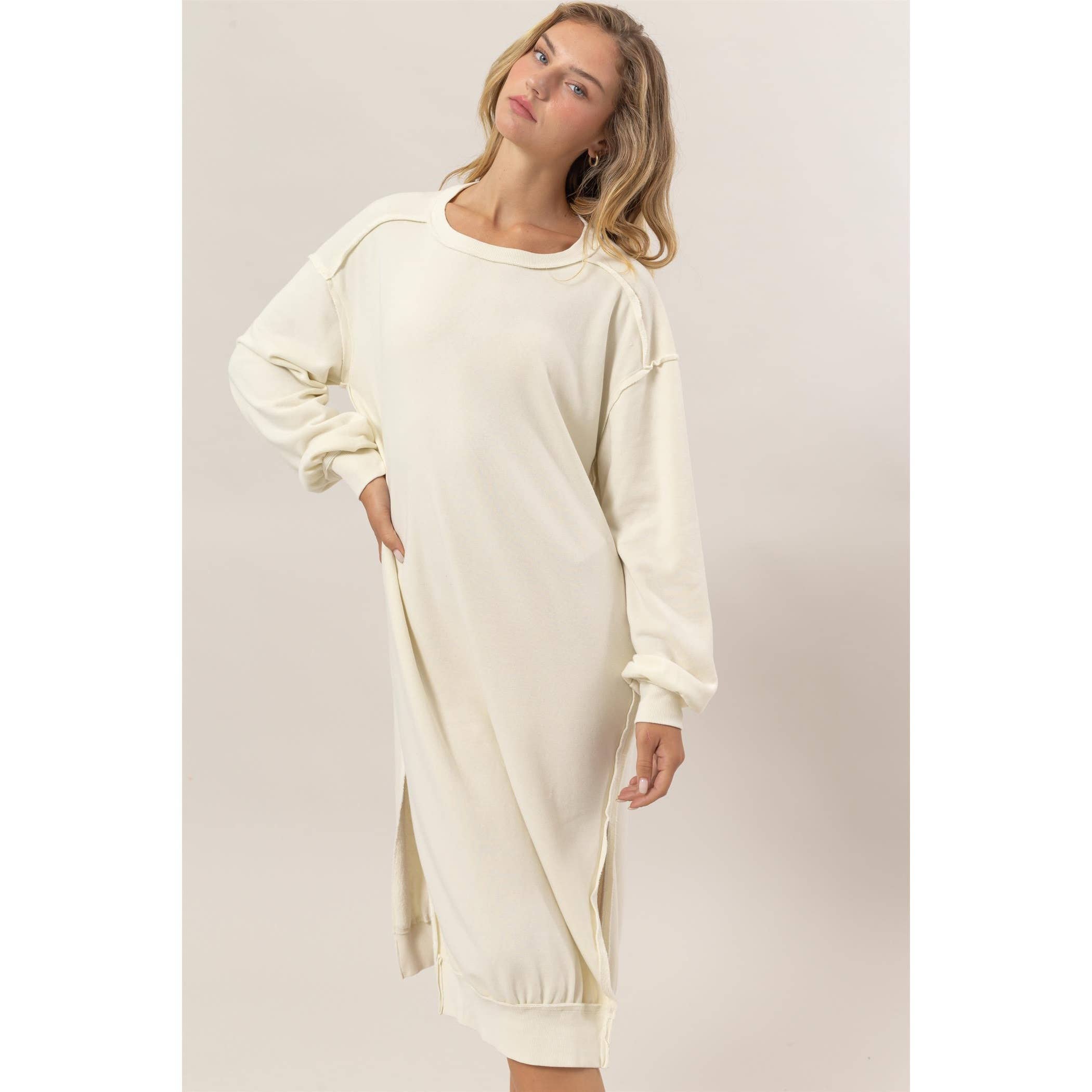 Looking on-trend is easy with this pullover dress. This cute dress boasts a relaxed silhouette with a round neck, drop shoulders and long sleeves attached to an oversized bodice that falls to a midi skirt. Side splits complete the look. Self : 80% Cotton / 20% Polyester Contrast : 95% Cotton / 5% Spandex Model Is 5' 9" Tall, 32" Chest, 23" Waist And 35" Hips And Wearing A Size Small Imported. Designed In The USA