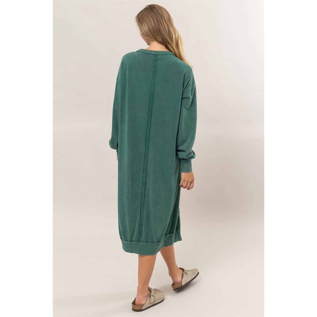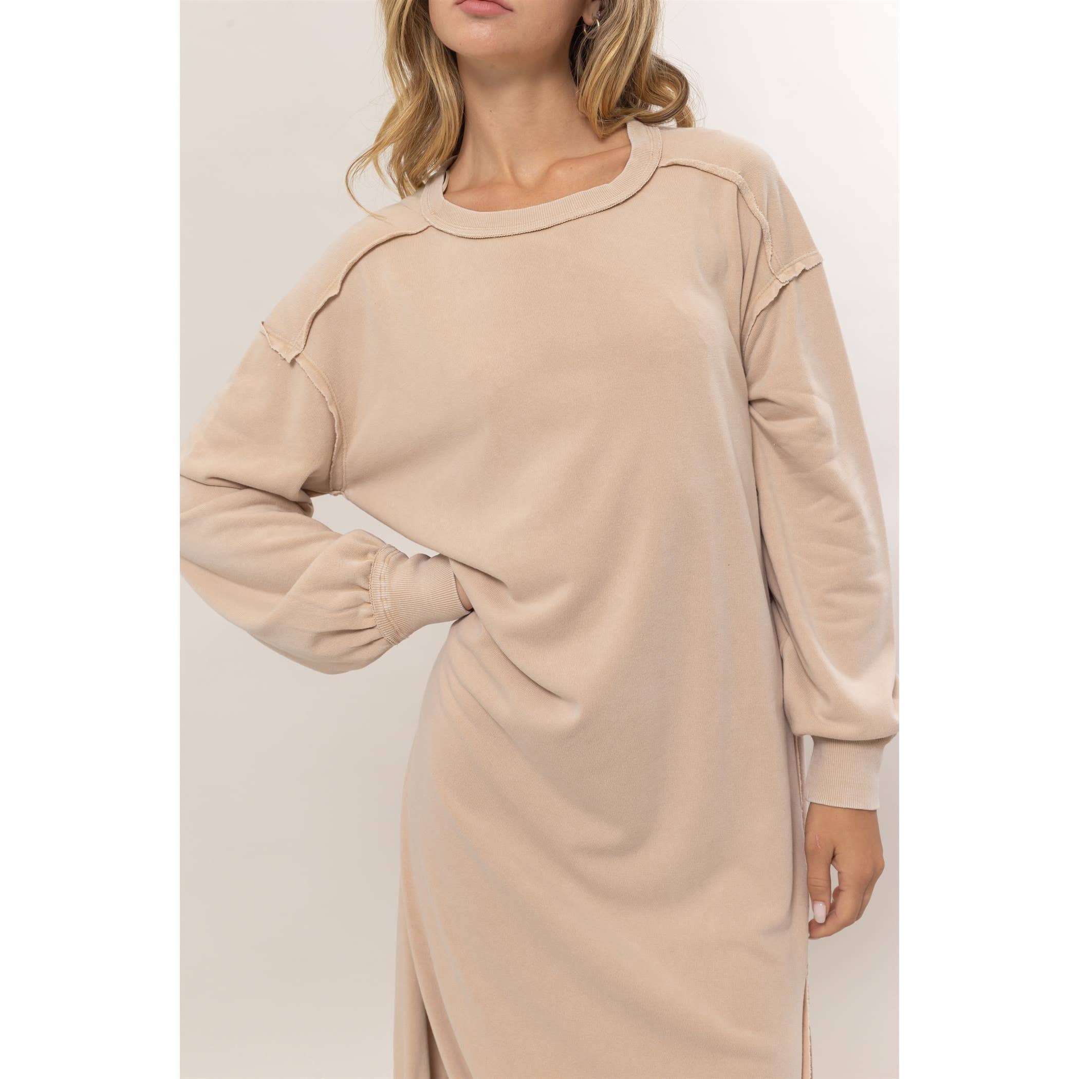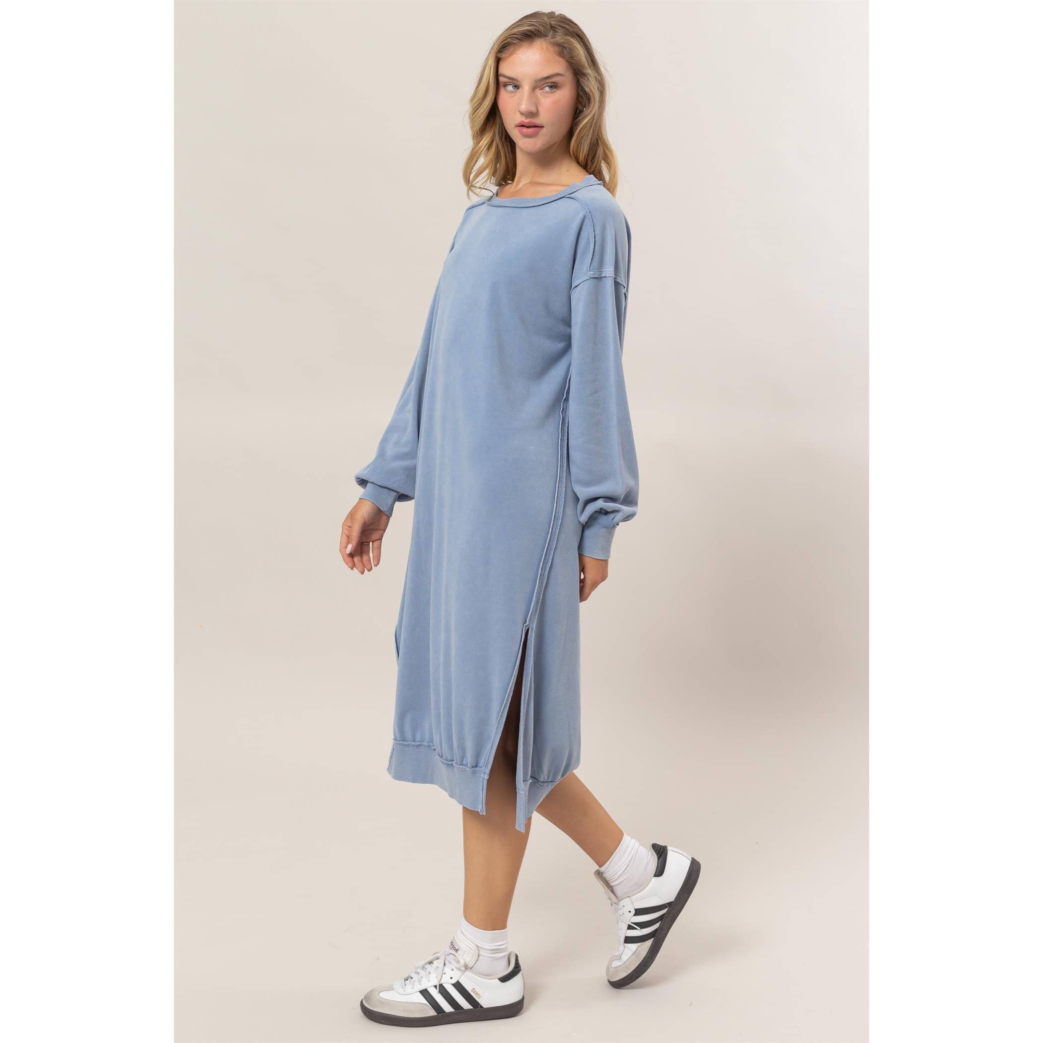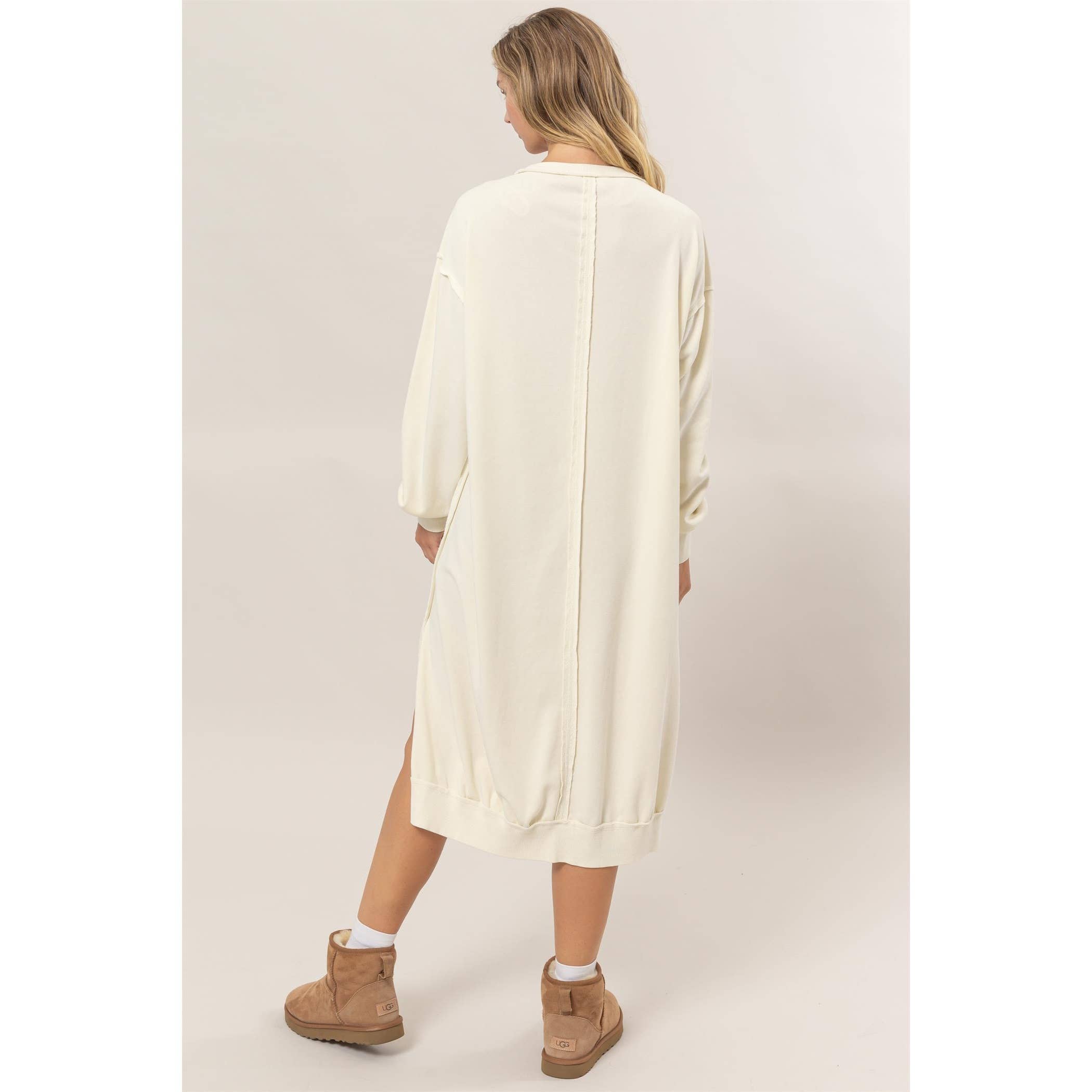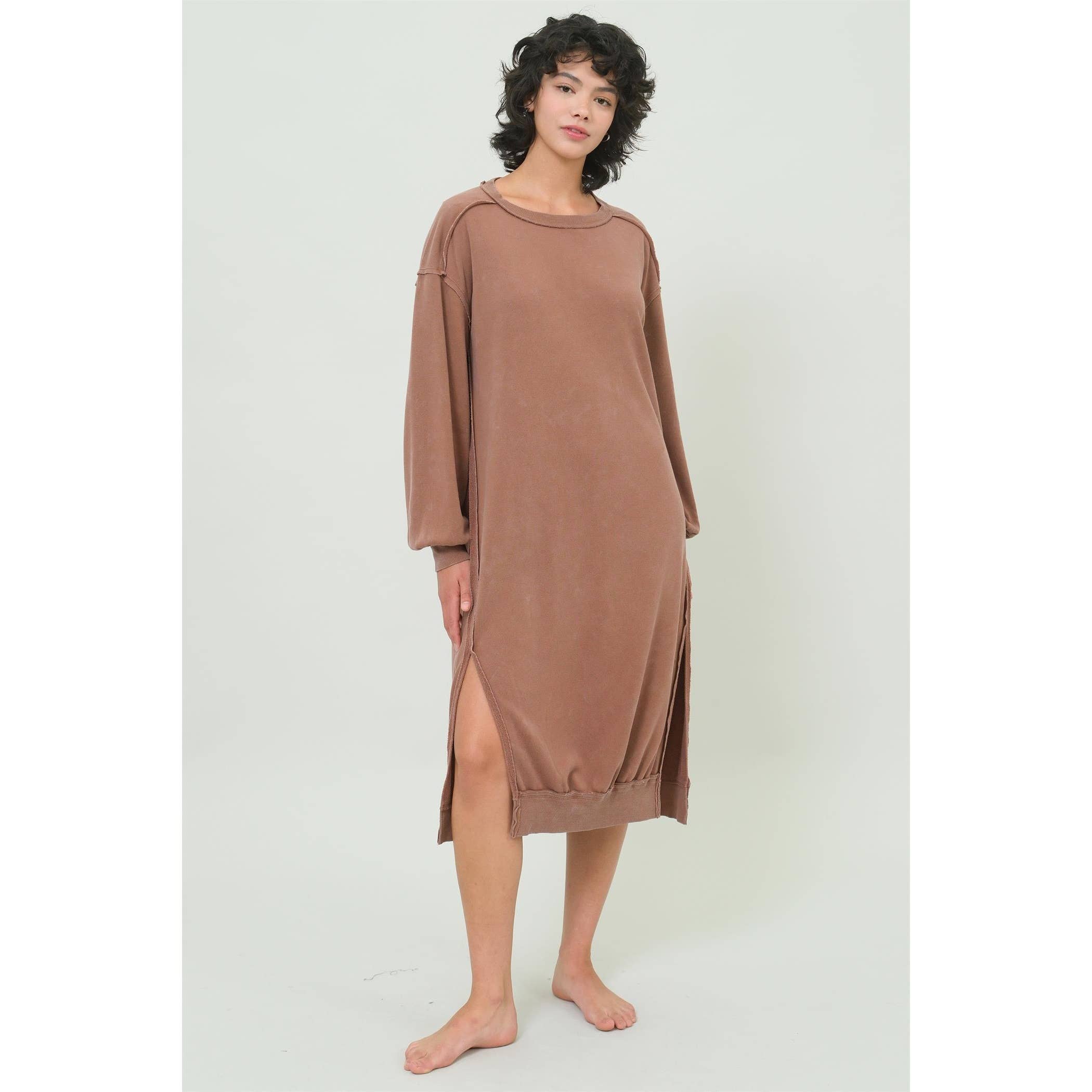 Looking on-trend is easy with this pullover dress. This cute dress boasts a relaxed silhouette with a round neck, drop shoulders and long sleeves attached to an oversized bodice that falls to a midi skirt. Side splits complete the look. Self : 80% Cotton / 20% Polyester Contrast : 95% Cotton / 5% Spandex Model Is 5' 9" Tall, 32" Chest, 23" Waist And 35" Hips And Wearing A Size Small Imported. Designed In The USA