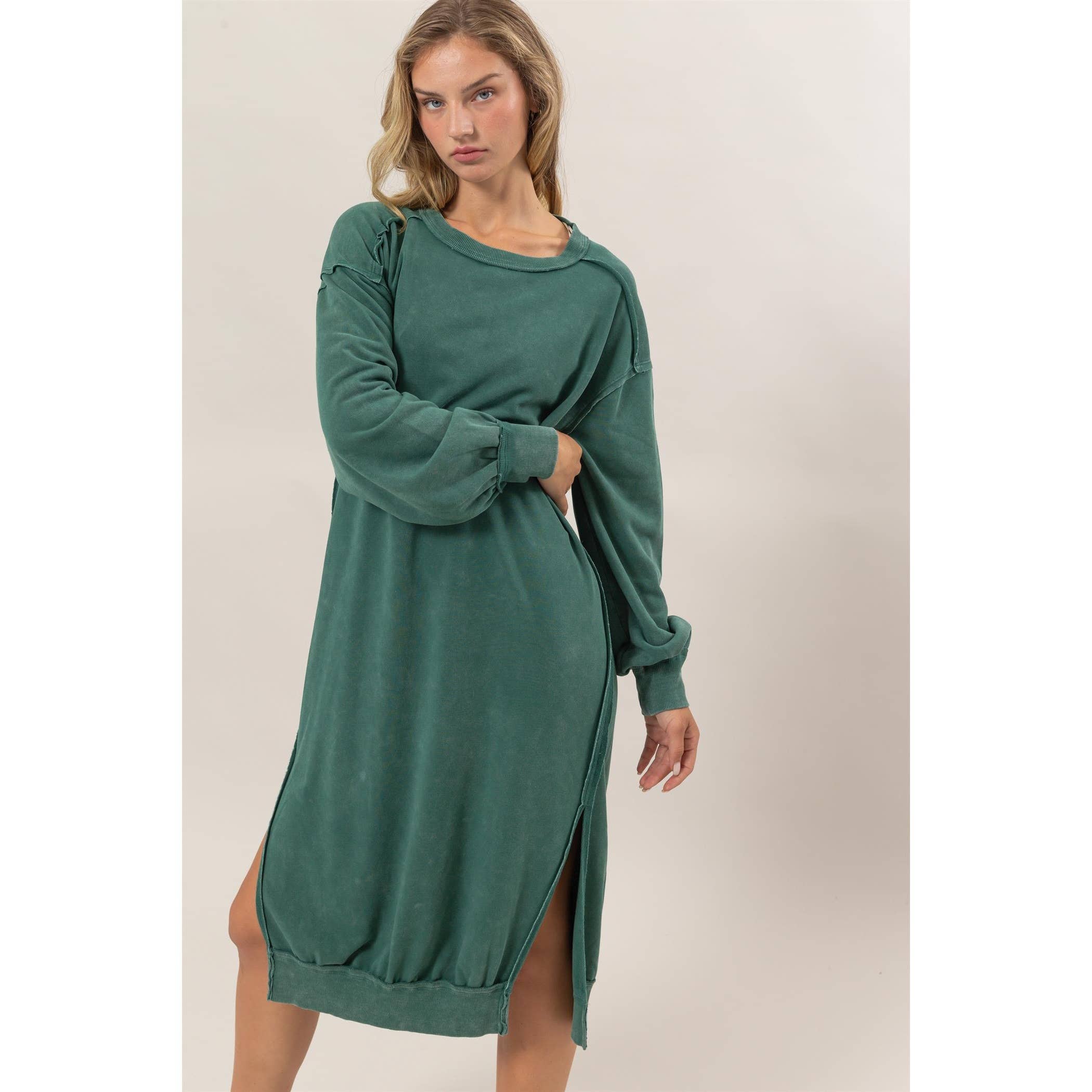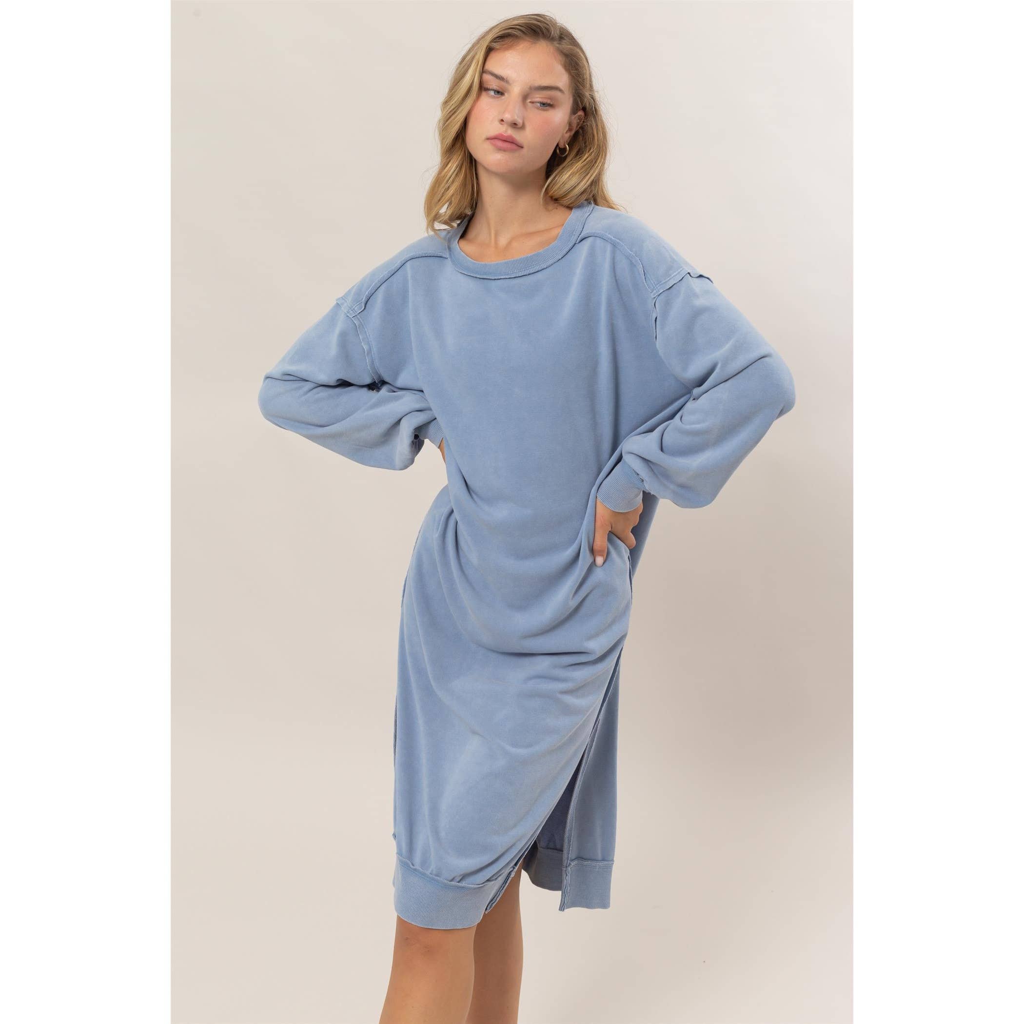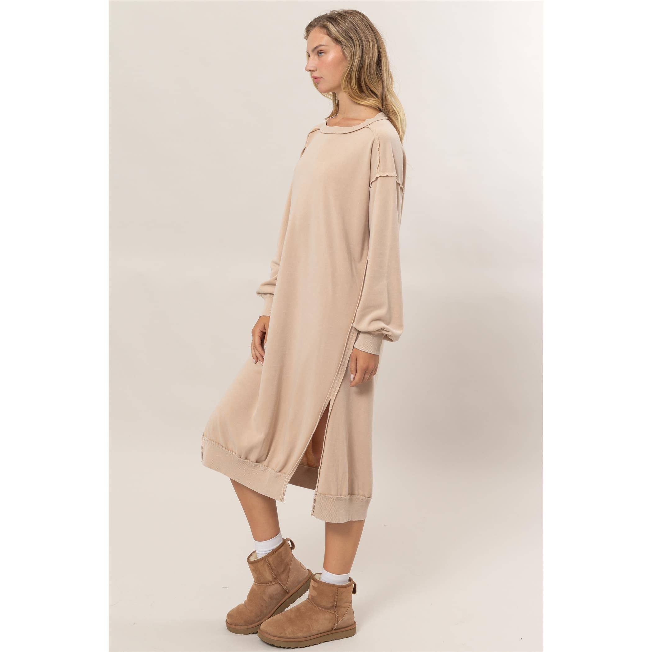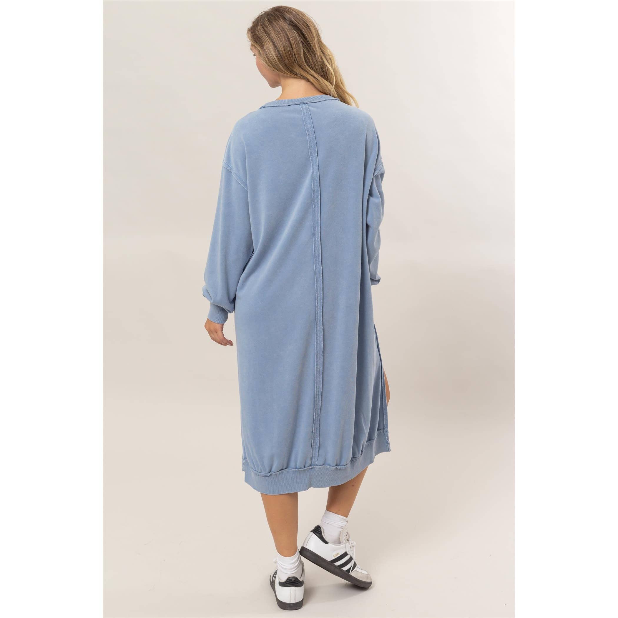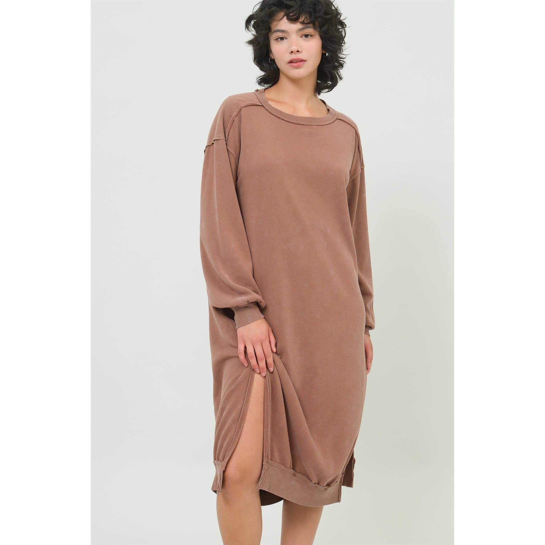 Looking on-trend is easy with this pullover dress. This cute dress boasts a relaxed silhouette with a round neck, drop shoulders and long sleeves attached to an oversized bodice that falls to a midi skirt. Side splits complete the look. Self : 80% Cotton / 20% Polyester Contrast : 95% Cotton / 5% Spandex Model Is 5' 9" Tall, 32" Chest, 23" Waist And 35" Hips And Wearing A Size Small Imported. Designed In The USA