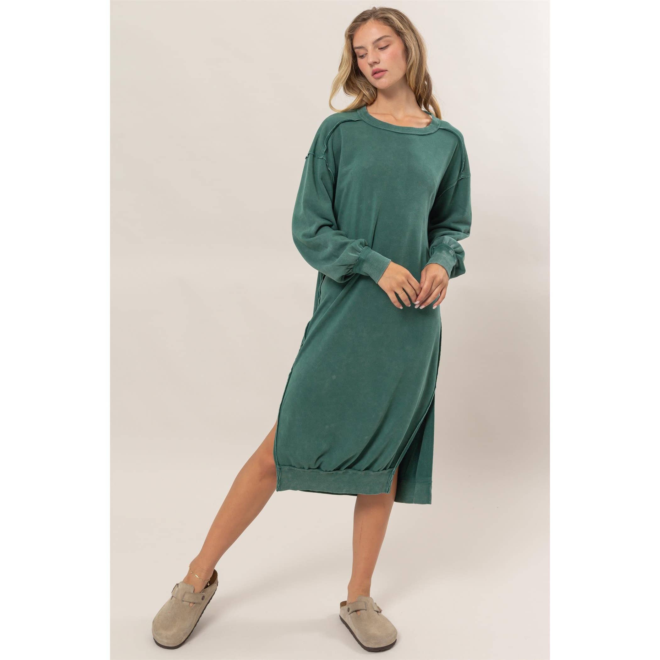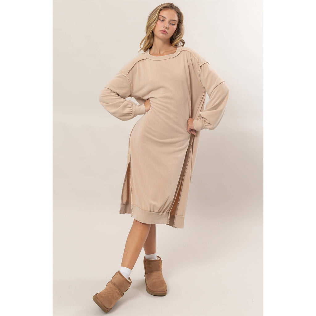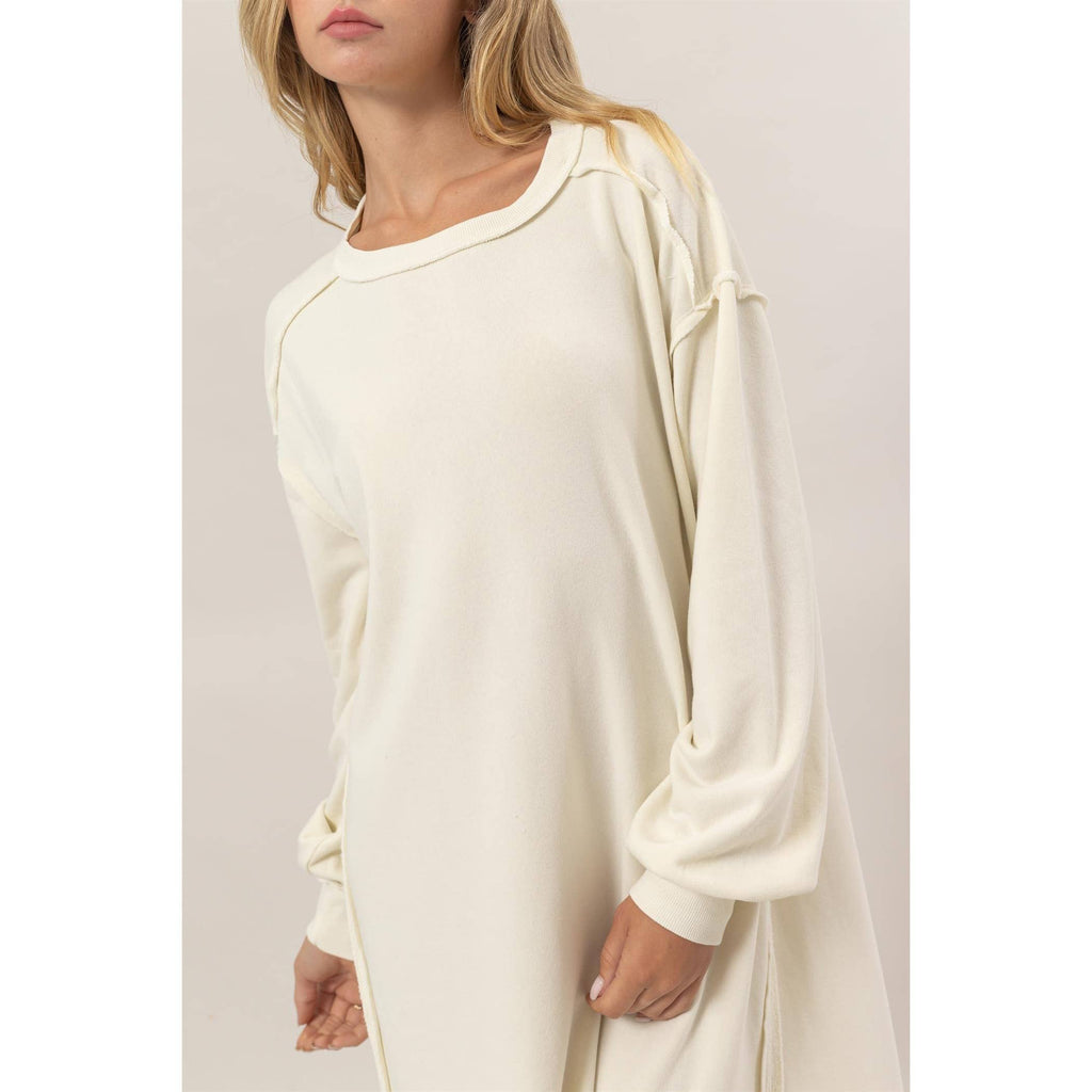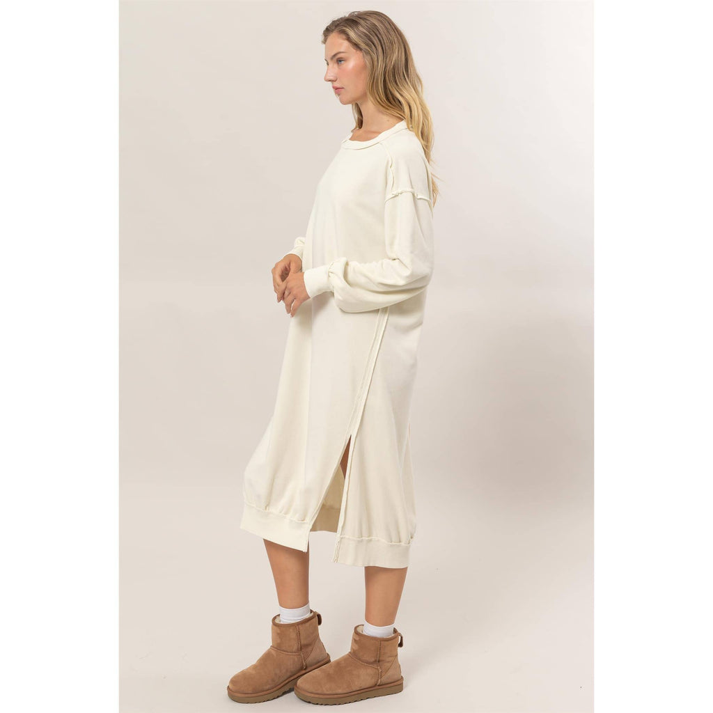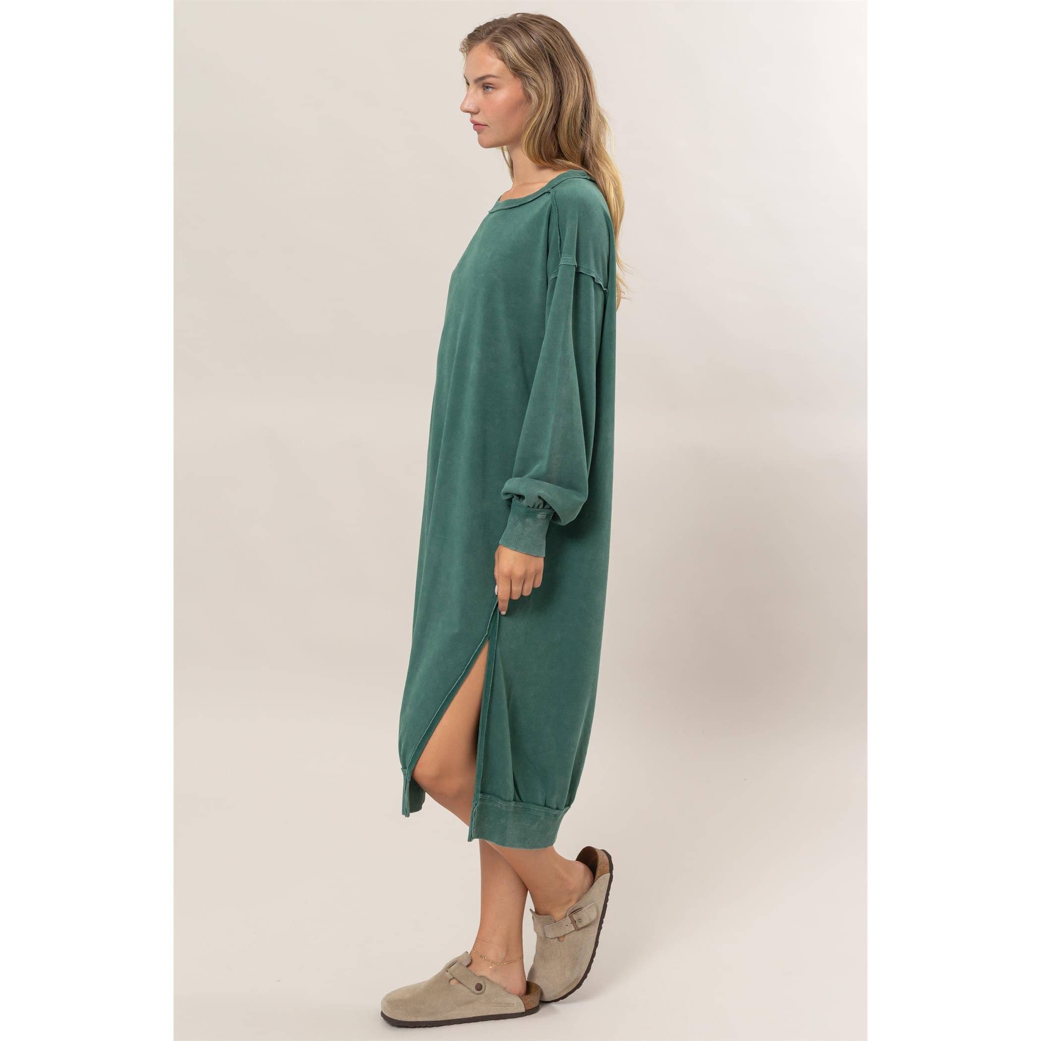 Looking on-trend is easy with this pullover dress. This cute dress boasts a relaxed silhouette with a round neck, drop shoulders and long sleeves attached to an oversized bodice that falls to a midi skirt. Side splits complete the look. Self : 80% Cotton / 20% Polyester Contrast : 95% Cotton / 5% Spandex Model Is 5' 9" Tall, 32" Chest, 23" Waist And 35" Hips And Wearing A Size Small Imported. Designed In The USA