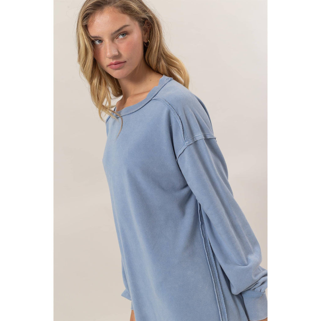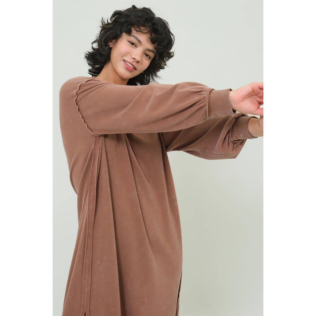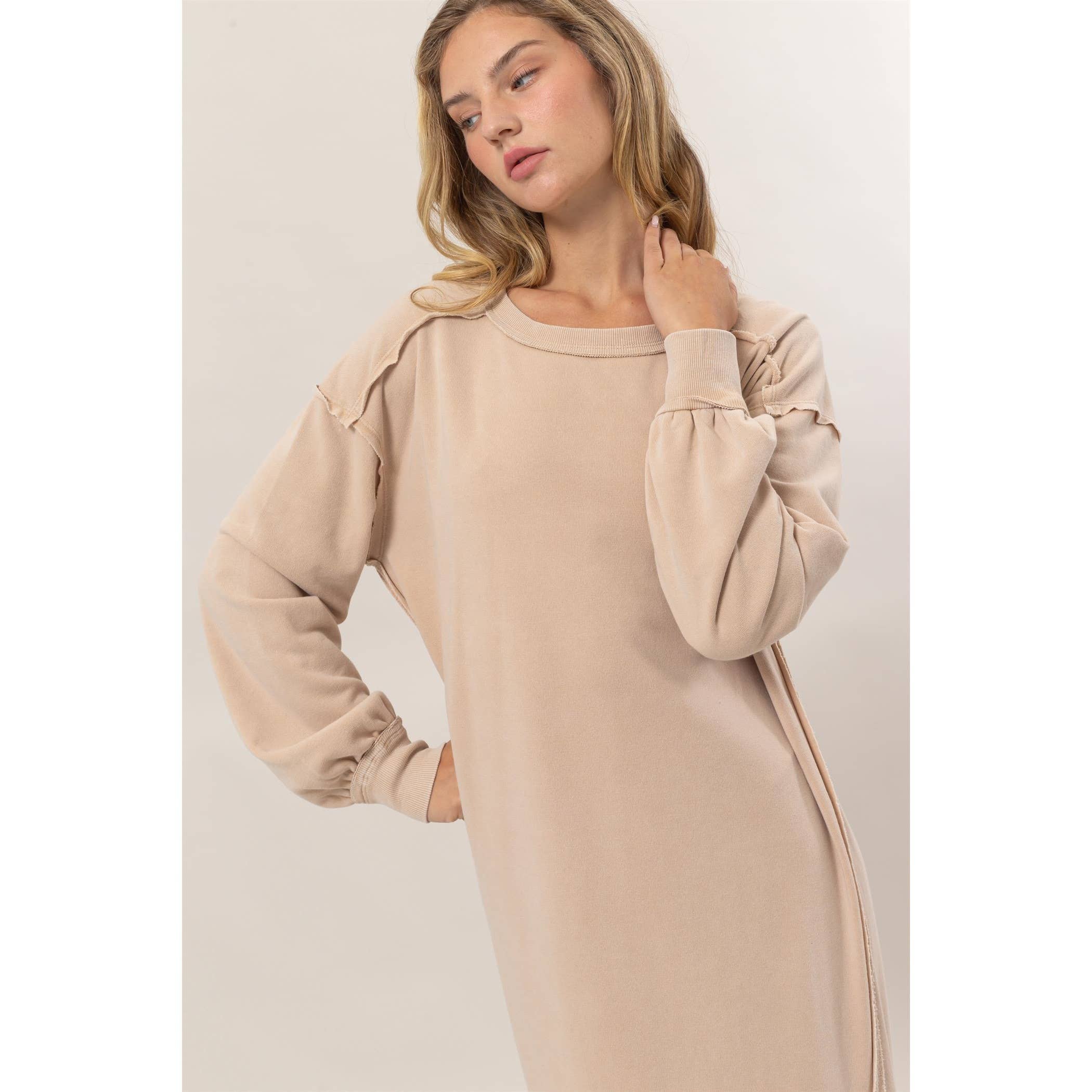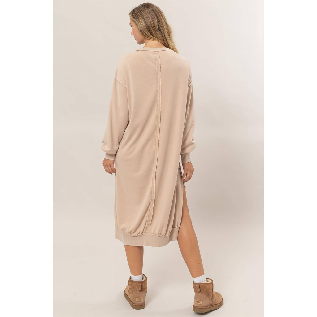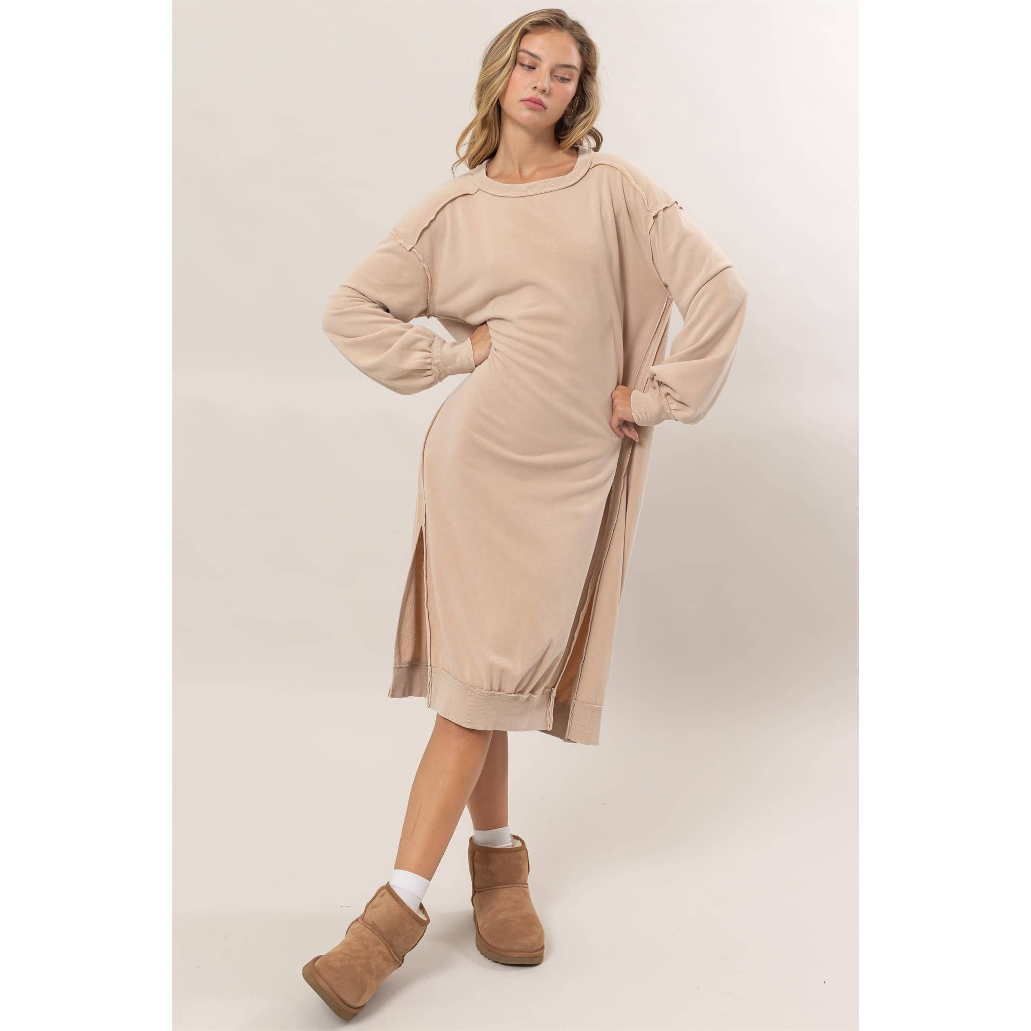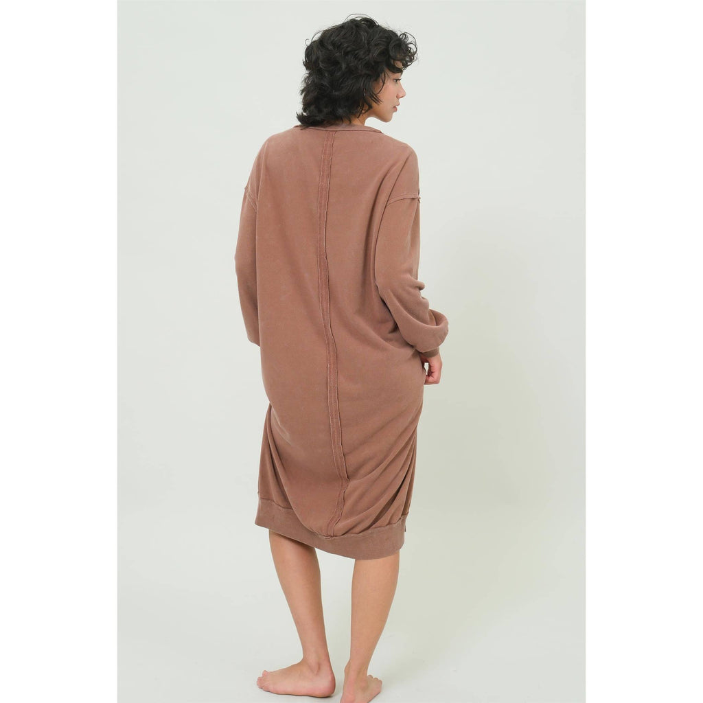 Looking on-trend is easy with this pullover dress. This cute dress boasts a relaxed silhouette with a round neck, drop shoulders and long sleeves attached to an oversized bodice that falls to a midi skirt. Side splits complete the look. Self : 80% Cotton / 20% Polyester Contrast : 95% Cotton / 5% Spandex Model Is 5' 9" Tall, 32" Chest, 23" Waist And 35" Hips And Wearing A Size Small Imported. Designed In The USA